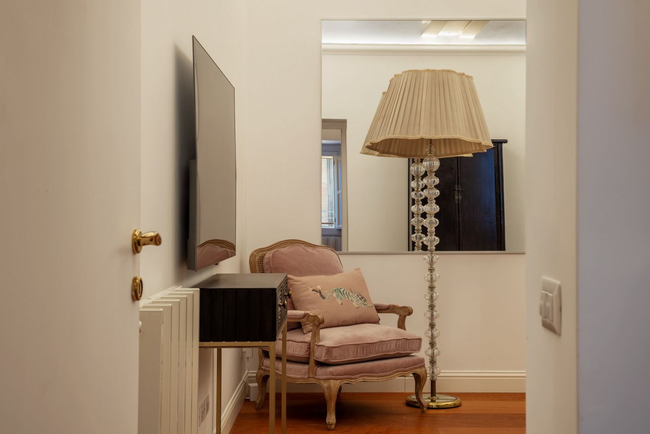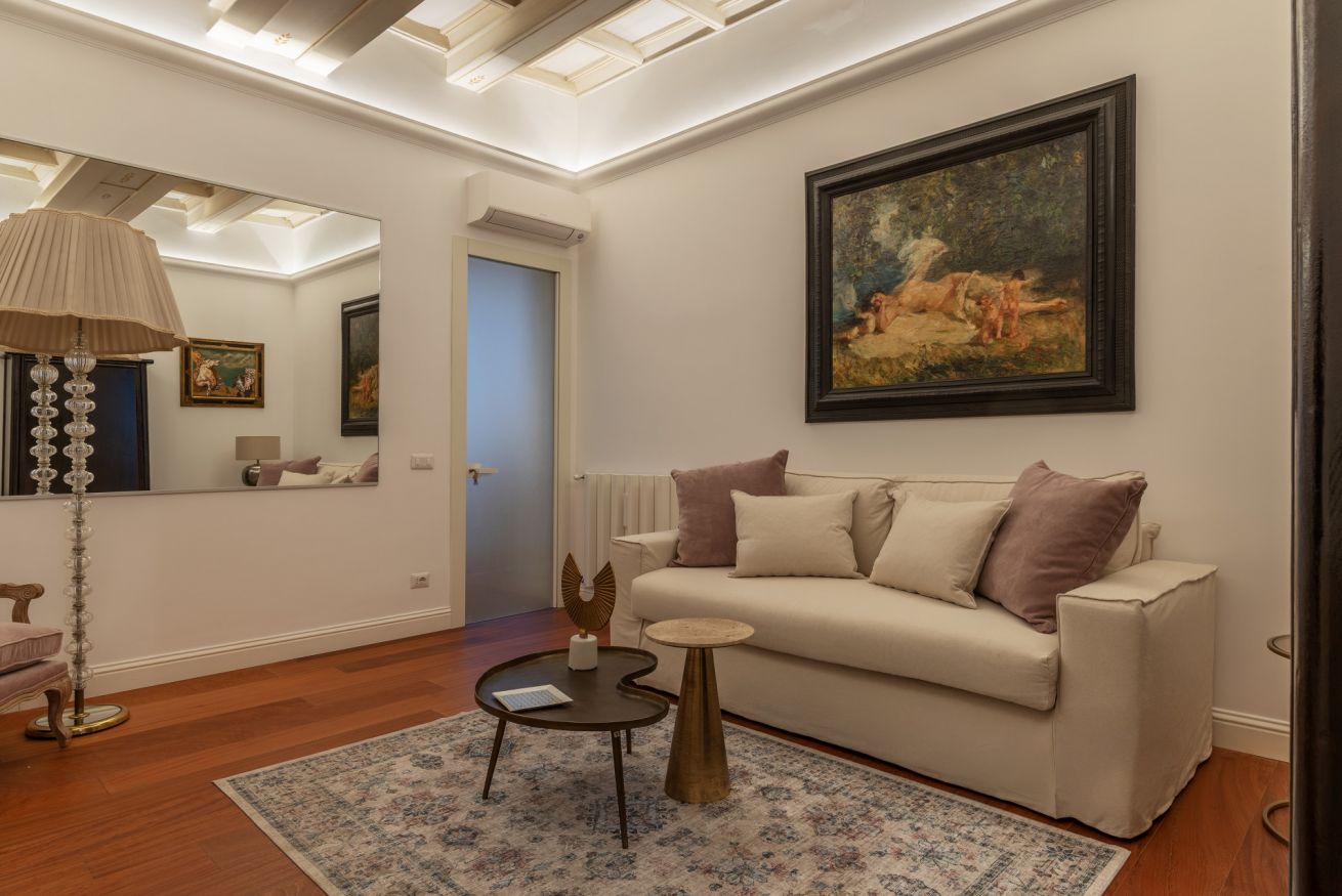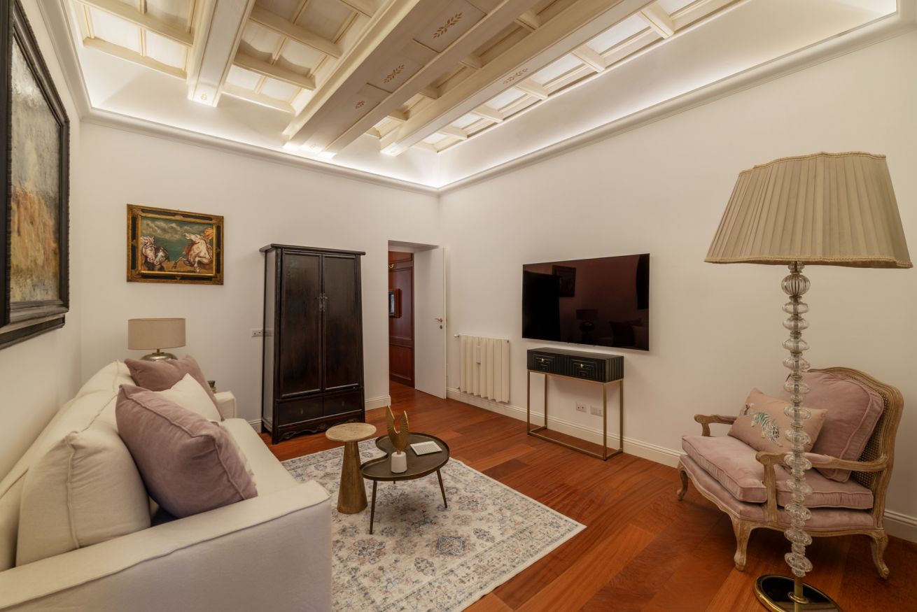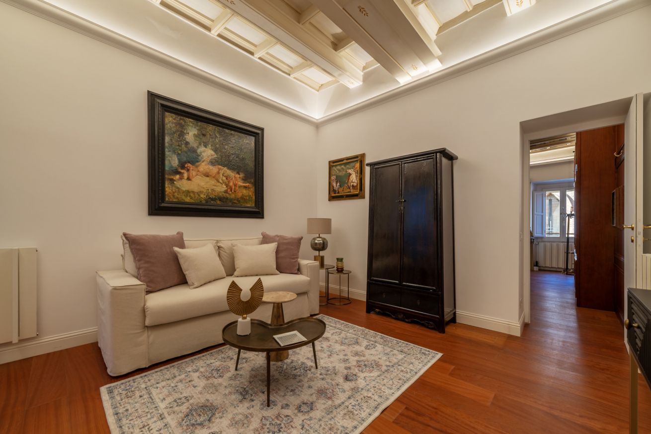 Located on the second floor (without elevator) of an elegant building at number 55 Via del Babuino — the legendary shopping street of the Eternal City — this exclusive apartment welcomes up to six guests in a space defined by refined architectural design and timeless charm.