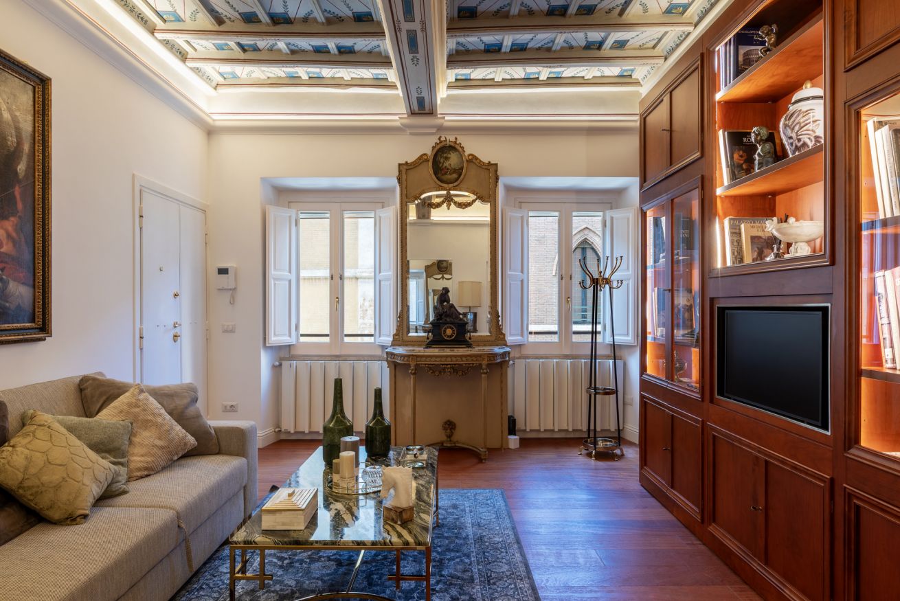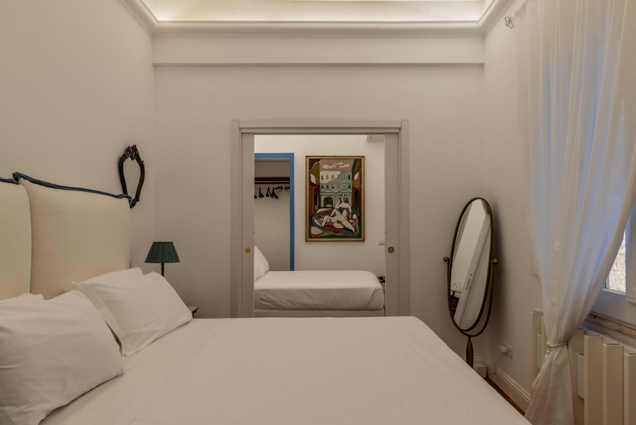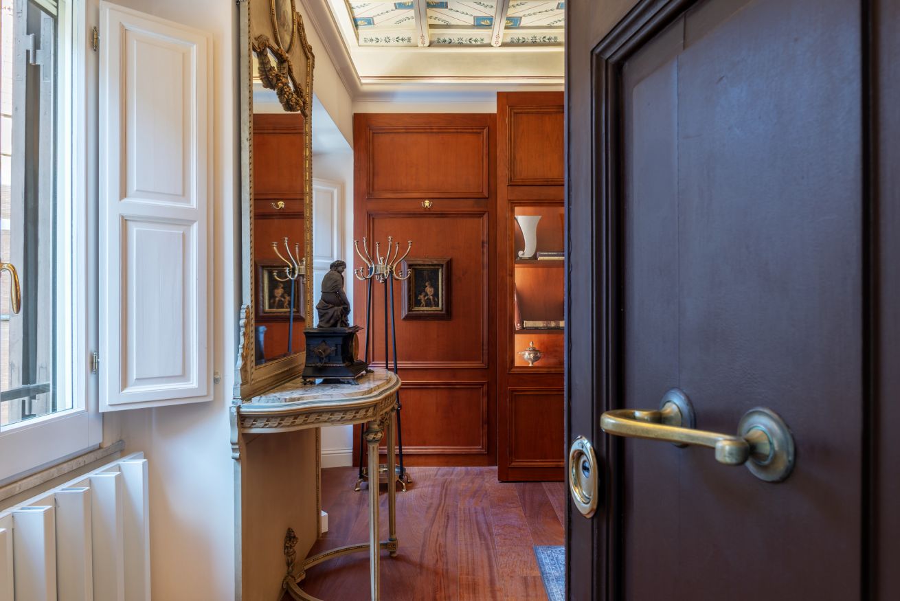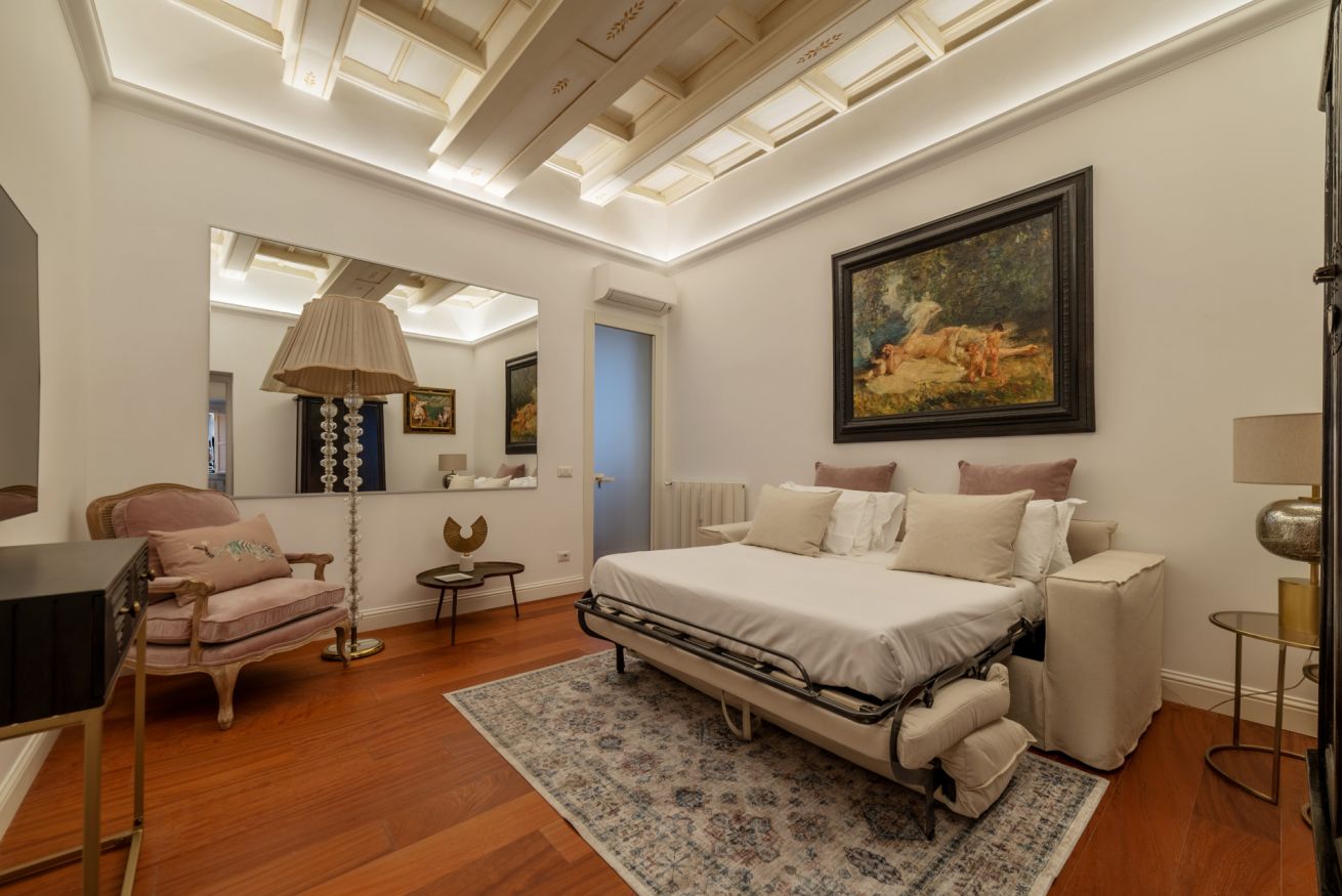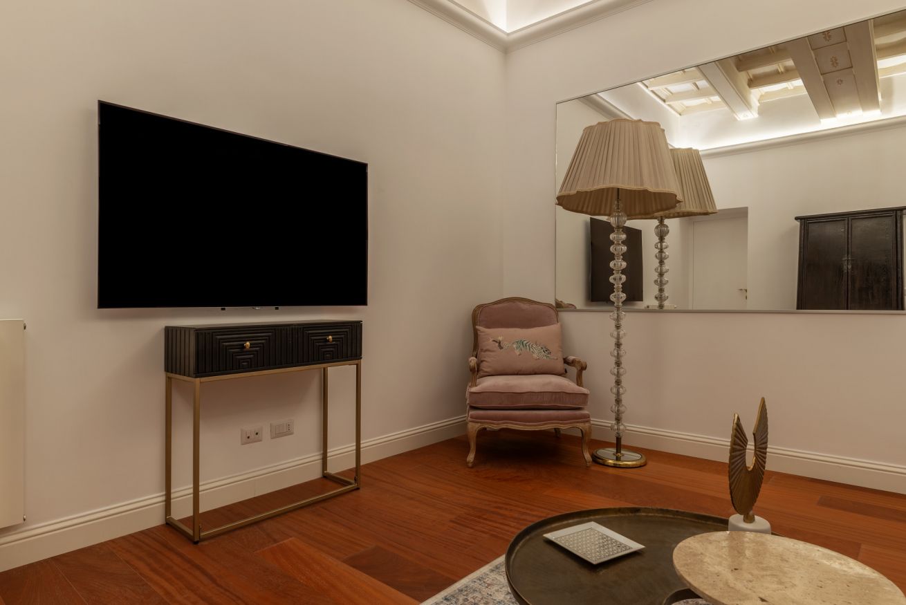 Located on the second floor (without elevator) of an elegant building at number 55 Via del Babuino — the legendary shopping street of the Eternal City — this exclusive apartment welcomes up to six guests in a space defined by refined architectural design and timeless charm.