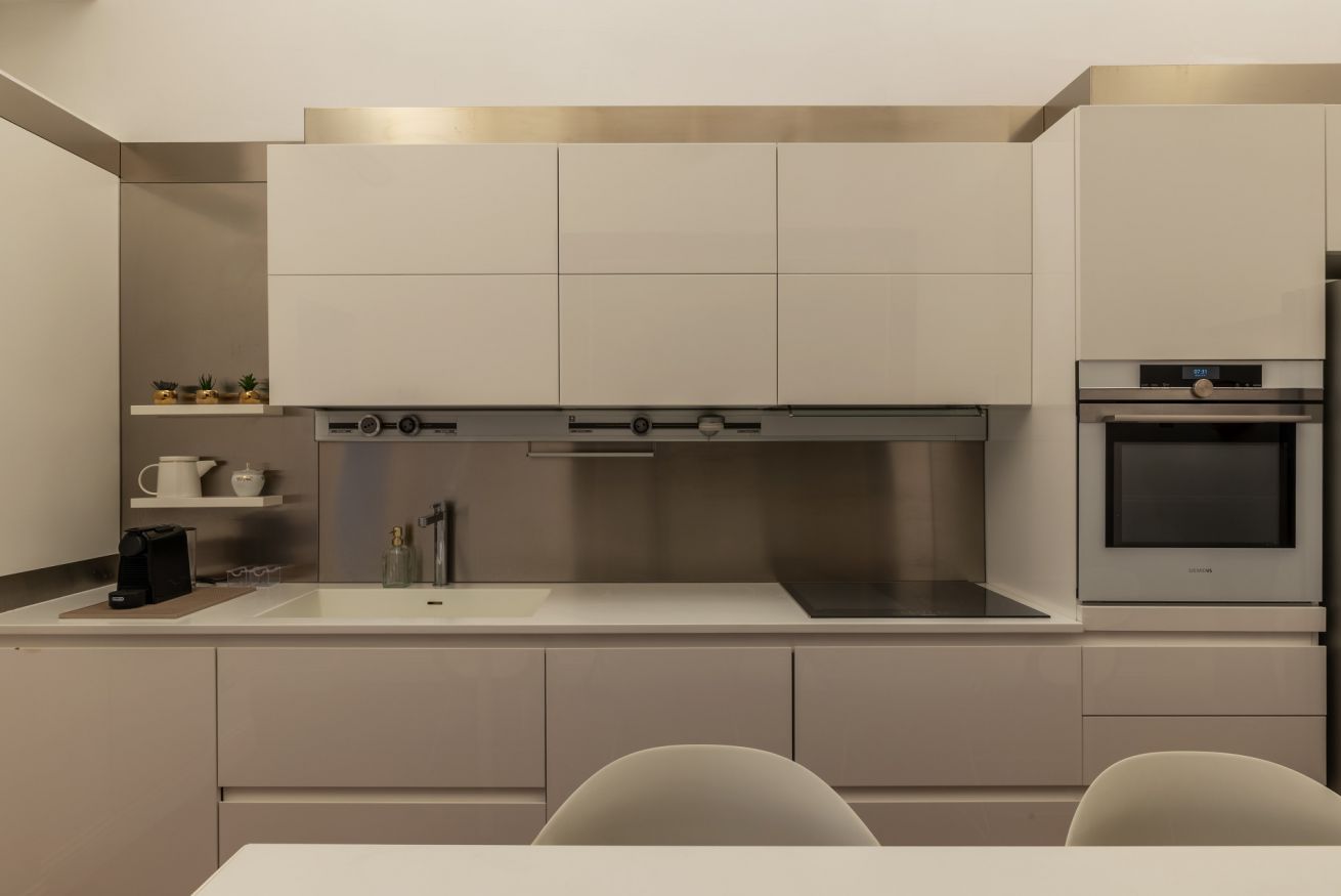 The modern, fully equipped kitchen features a large refrigerator with Ice Maker, Nespresso machine, oven, washing machine, dishwasher, and everything you need to cook and share meals around the dining table.