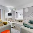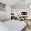 The key feature here has to be the movable partition wall, which allows guests to create separate areas for the bedroom and kitchenette, ensuring privacy or maintaining an open layout, depending on one's need.