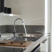 The kitchen is fully equipped with all essential appliances, including a dishwasher. A breakfast bar in the American style adds a practical and cozy touch for quick meals or snacks.