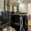 The modern and functional bathroom features a spacious walk-in shower and a washer-dryer combo, making it ideal for longer stays.