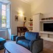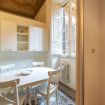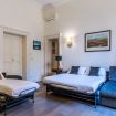 The interiors feature a spacious and bright living room, furnished with a comfortable sofa bed, an armchair bed, a desk, and a Smart TV. The dining room, adorned with a magnificent historic fresco, is connected to a fully equipped kitchen with an oven, stovetop, refrigerator, freezer, and Nespresso coffee machine.