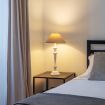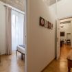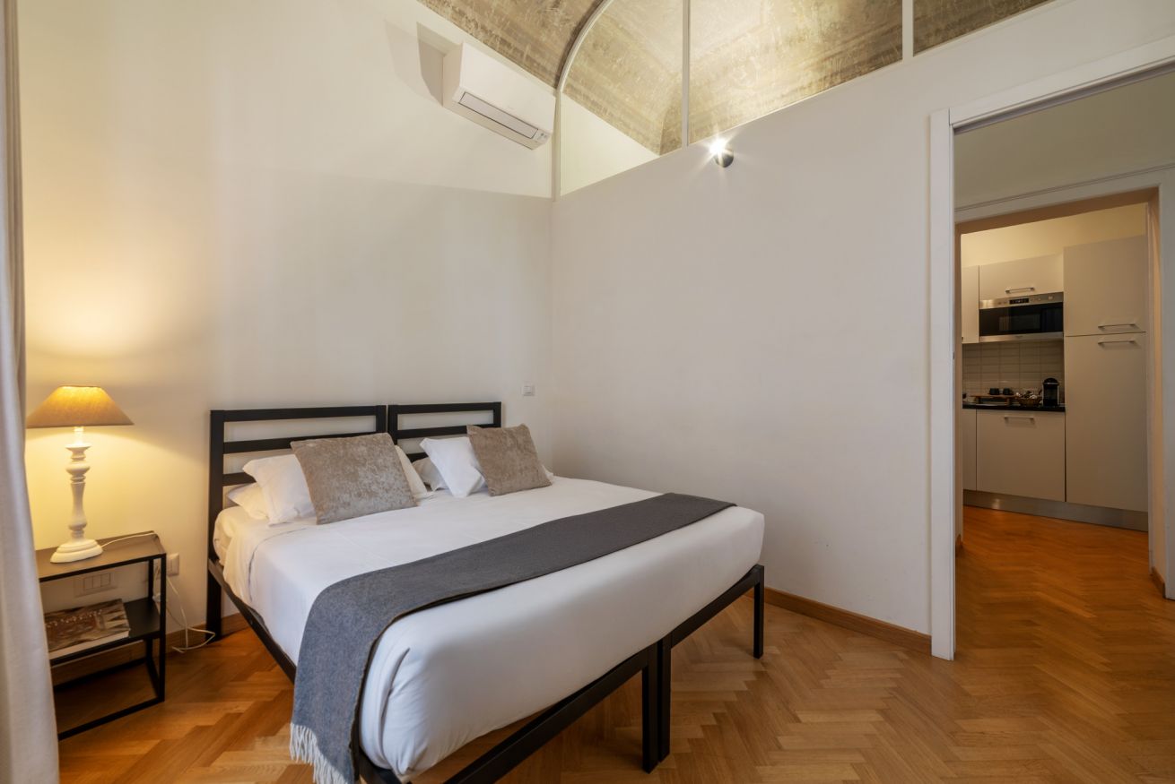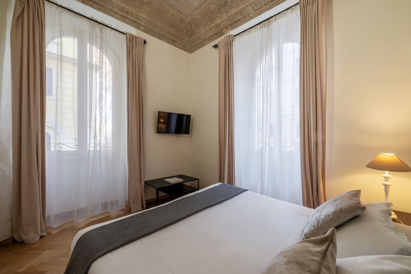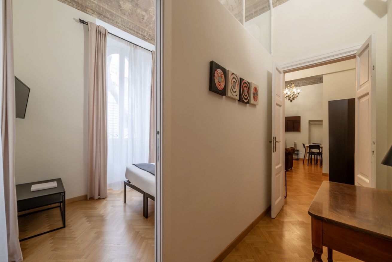 In keeping with the style of the times, the ceilings have maintained their original frescoes and chandeliers, but the renovation project has tastefully coupled the building’s long history with today’s decor solutions and amenities: the final result is a modern space dominated by natural light (notice the big windows!) and the impressive, sleek four-poster bed that occupies one end of the living room.