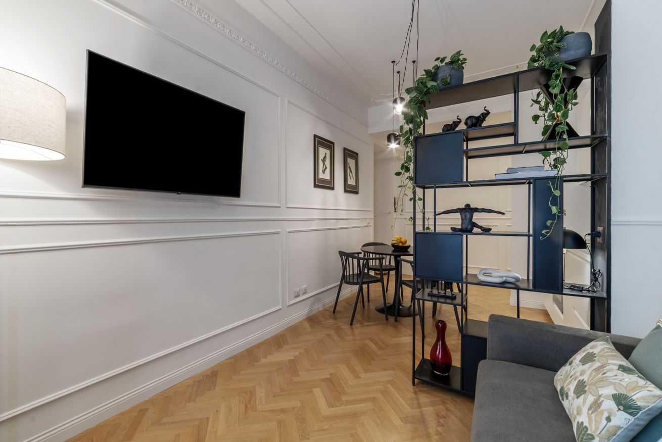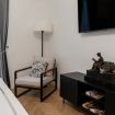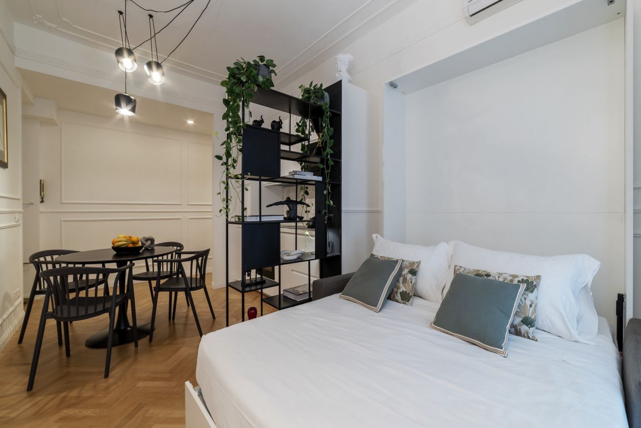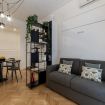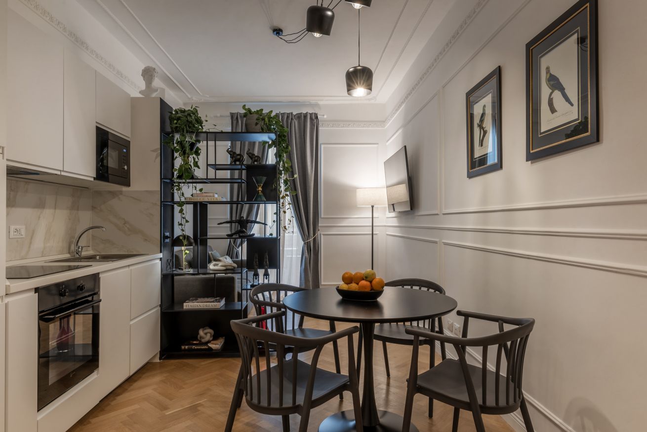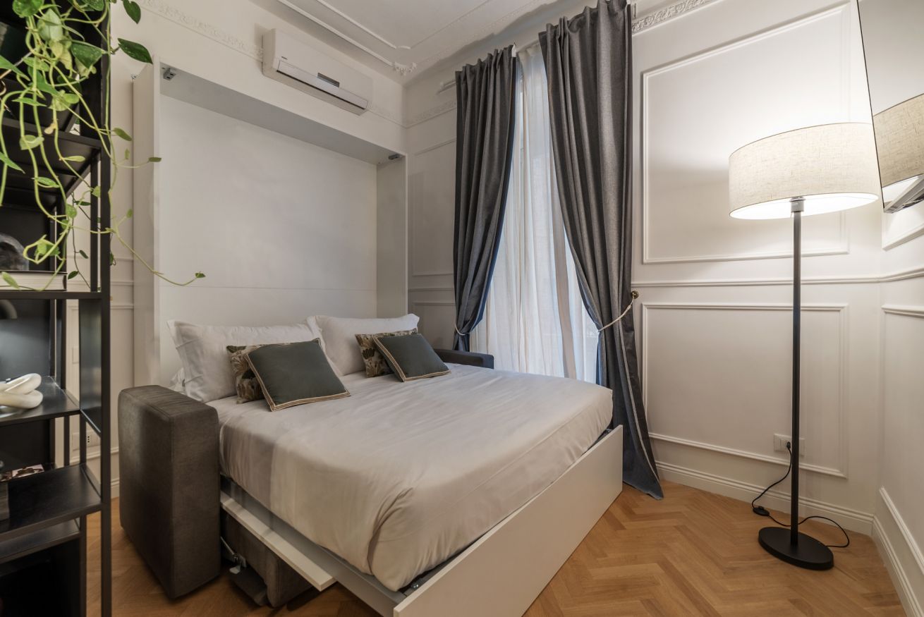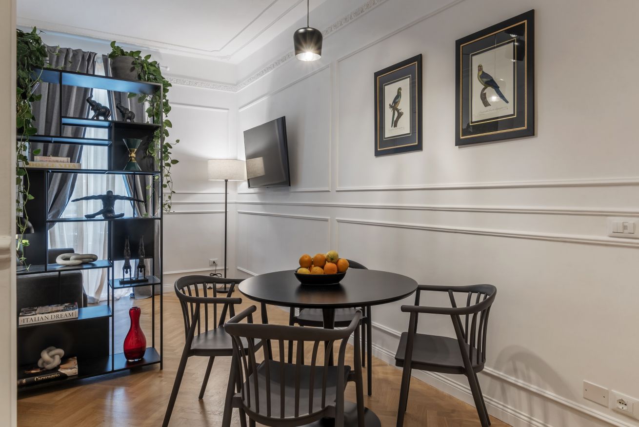 Toscana 2 is a one-bedroom apartment that has been recently renovated in a decidedly mid-century modern style, while preserving some of the original features of the accommodation, such as the hardwood floors. Guests enter into a dining/living room/kitchenette that includes a comfortable double Murphy bed, which effectively means that this space can sleep up to four people. The master bedroom has a large wardrobe.