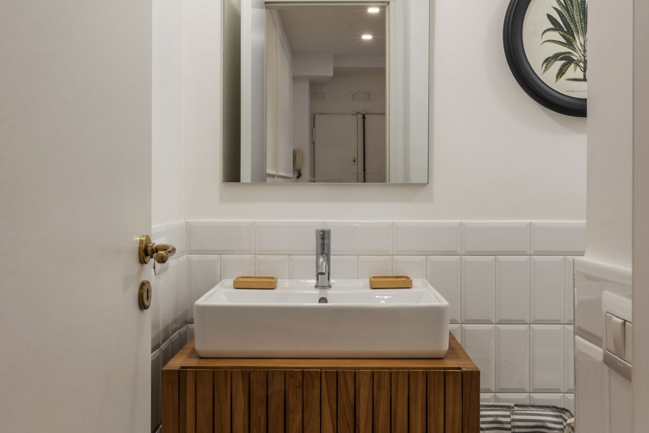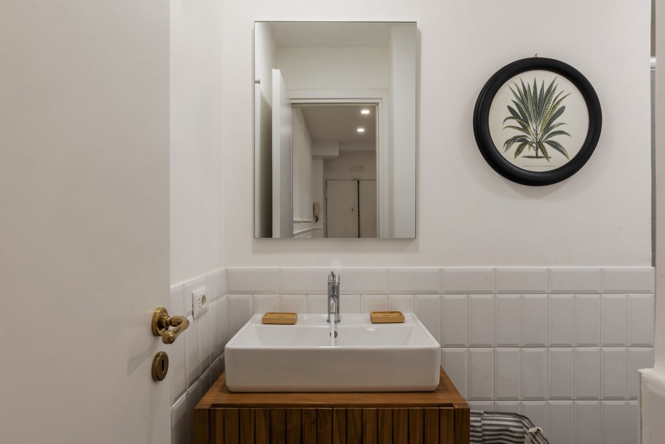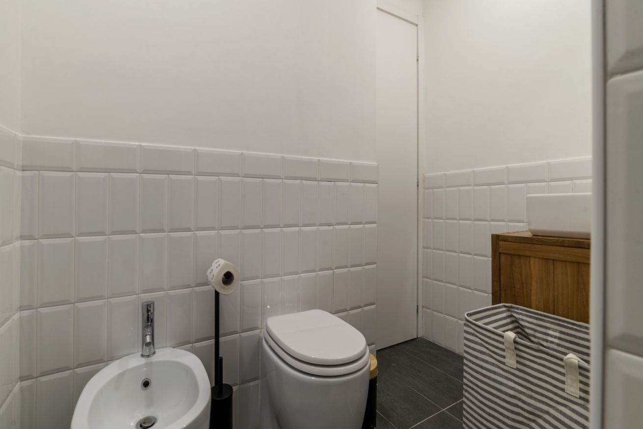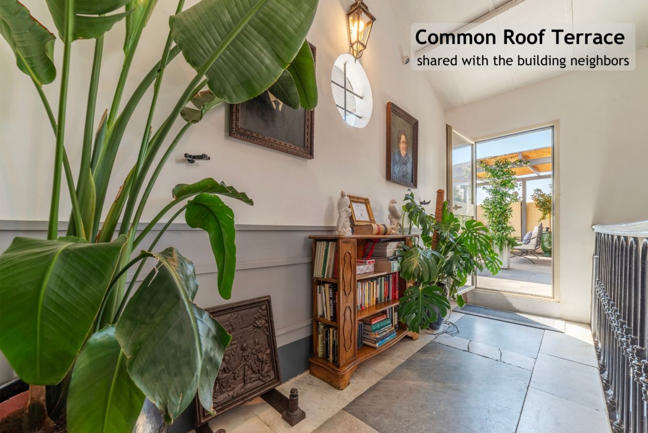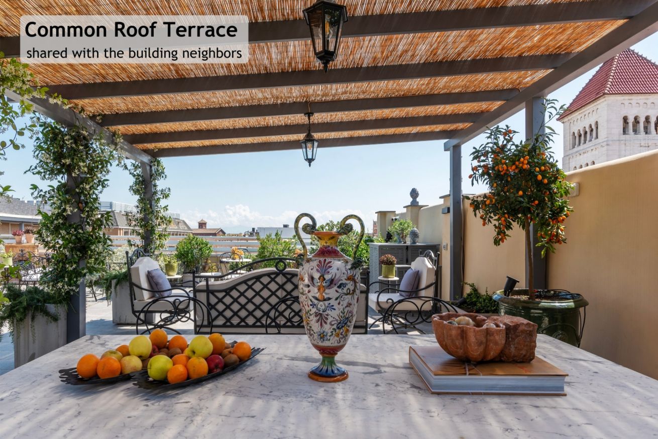 We kept for last the really unique feature of this apartment: the common terrace shared with the neighbors, complete with tables, lounge chairs and more, on top of the building. You’re free to use it during your stay from 8 am to 11 pm every day.