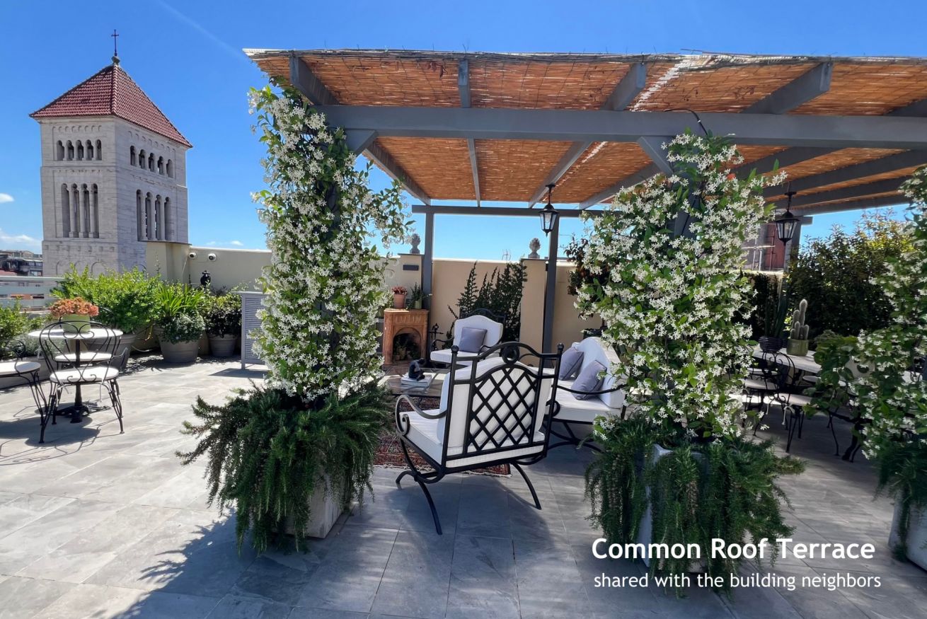 One of the highlights of Via Toscana 42 remains the shared condominium rooftop, available to all guests of the building. This terrace offers a small retreat suspended in the heart of the city, with water, coffee, tea and blankets provided for moments of relaxation. Whether for a quiet morning pause or an evening moment under the Roman sky, it adds a rare and authentic dimension to the stay. The rooftop terrace is a shared space with the other residents, open daily from 8:00 am to 11:00 pm.