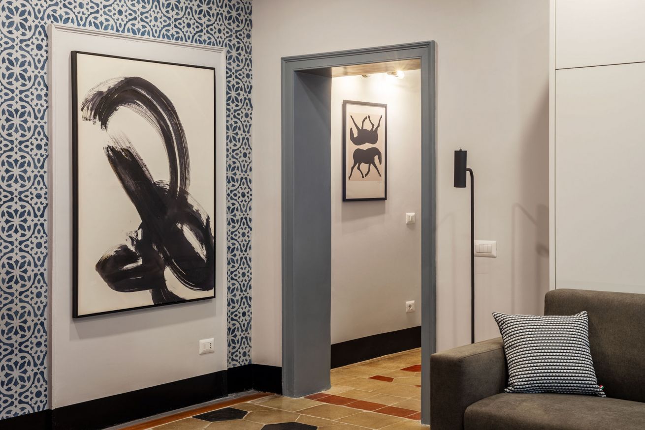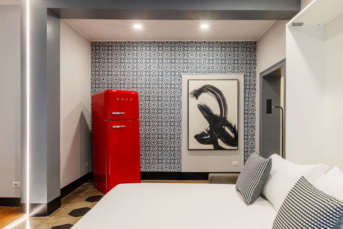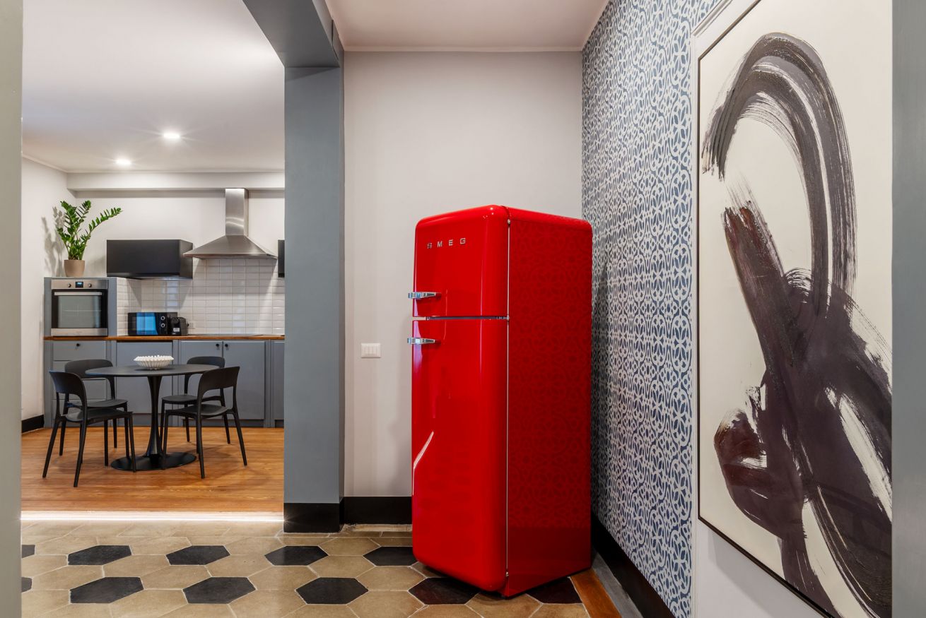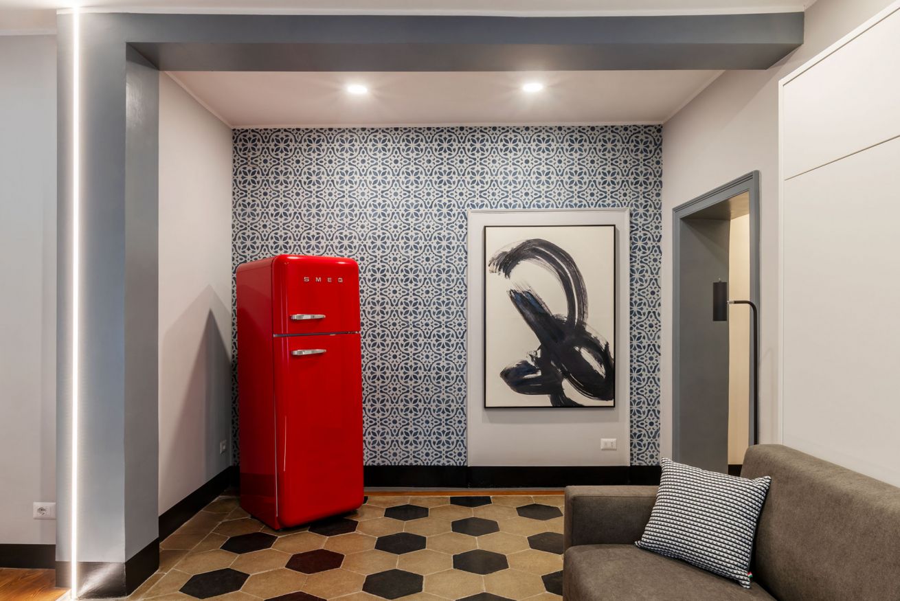 From the moment you enter, there is a clear balance between history and modern design. The original cementine floors, with their distinctive hexagonal geometries, bring warmth and personality to the space, while clean lines, soft grey tones and carefully selected artwork create a fresh and distinctive identity. The red SMEG refrigerator becomes an iconic, almost scenographic feature, interacting beautifully with the blue geometric wallpaper and the neutral palette of the furnishings, adding character without compromising the overall elegance.