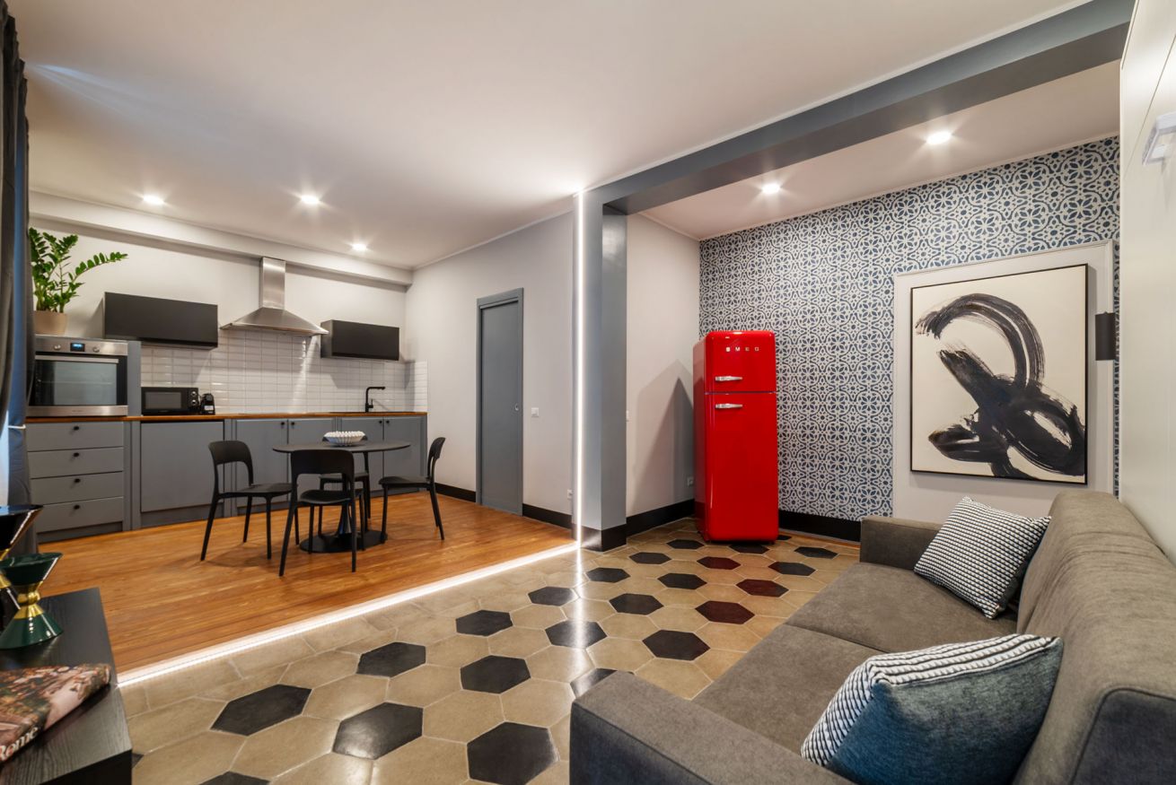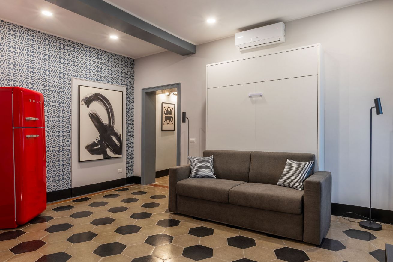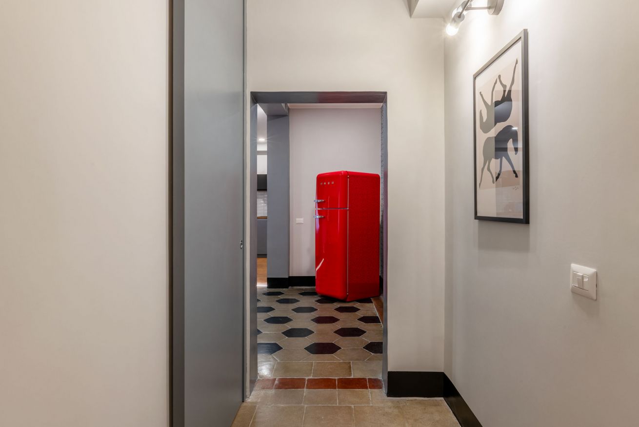 From the moment you enter, there is a clear balance between history and modern design. The original cementine floors, with their distinctive hexagonal geometries, bring warmth and personality to the space, while clean lines, soft grey tones and carefully selected artwork create a fresh and distinctive identity. The red SMEG refrigerator becomes an iconic, almost scenographic feature, interacting beautifully with the blue geometric wallpaper and the neutral palette of the furnishings, adding character without compromising the overall elegance.