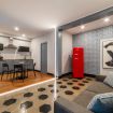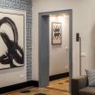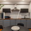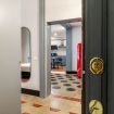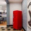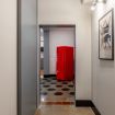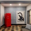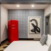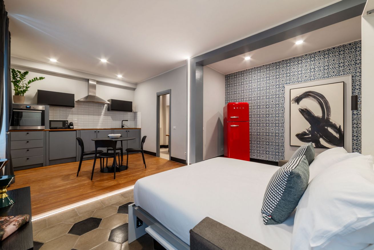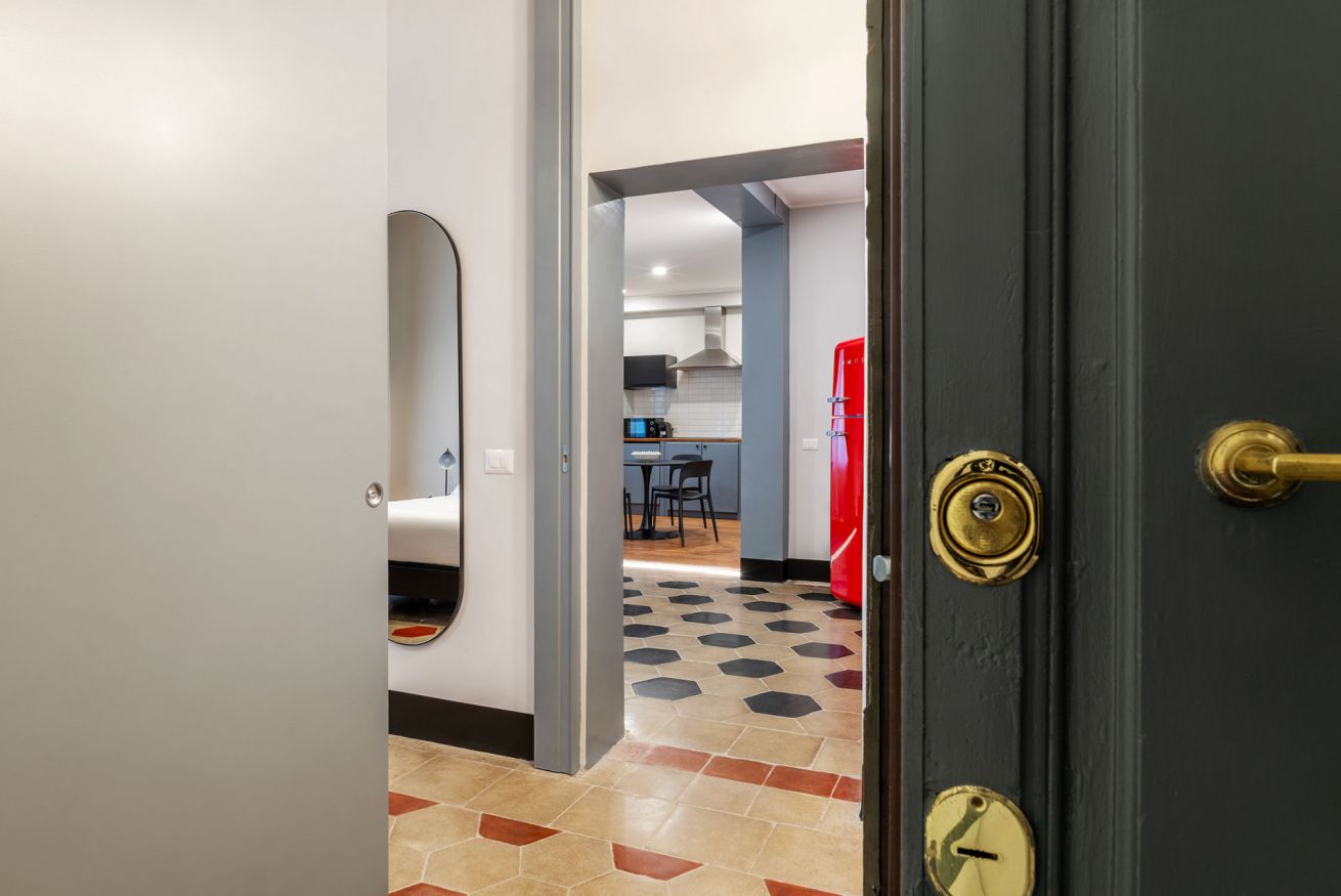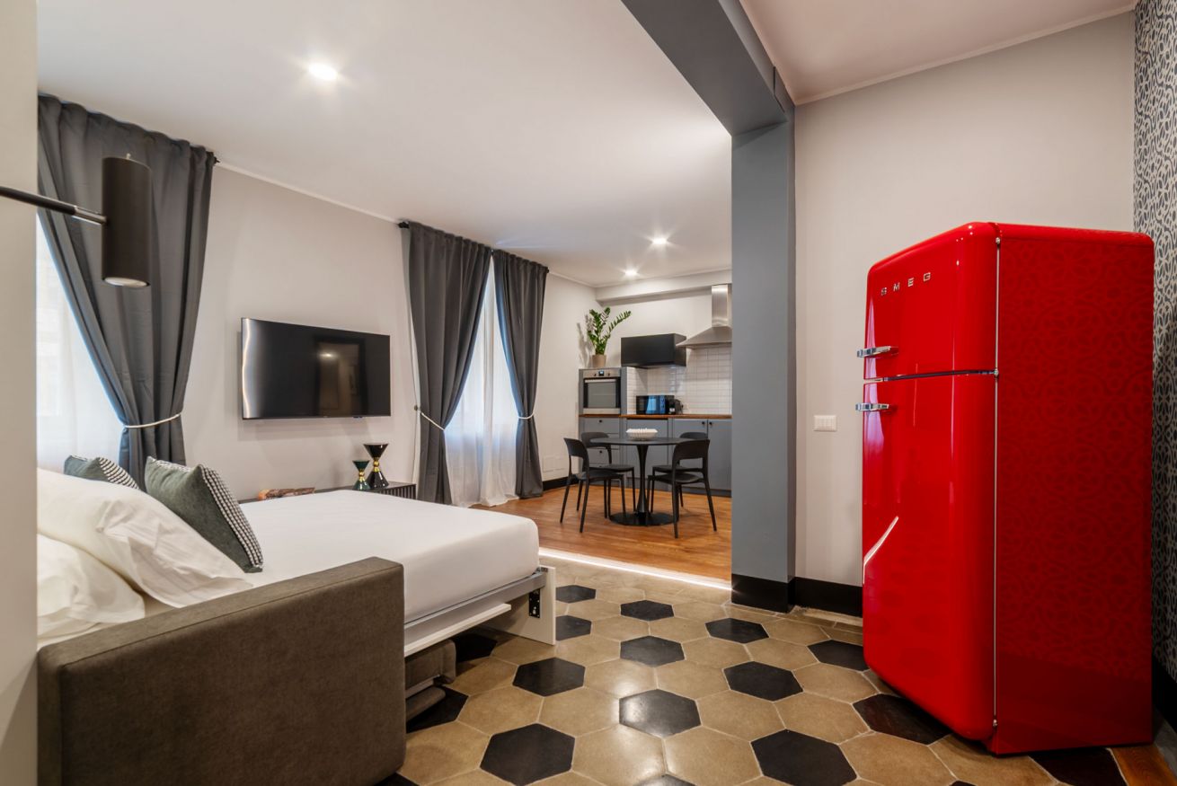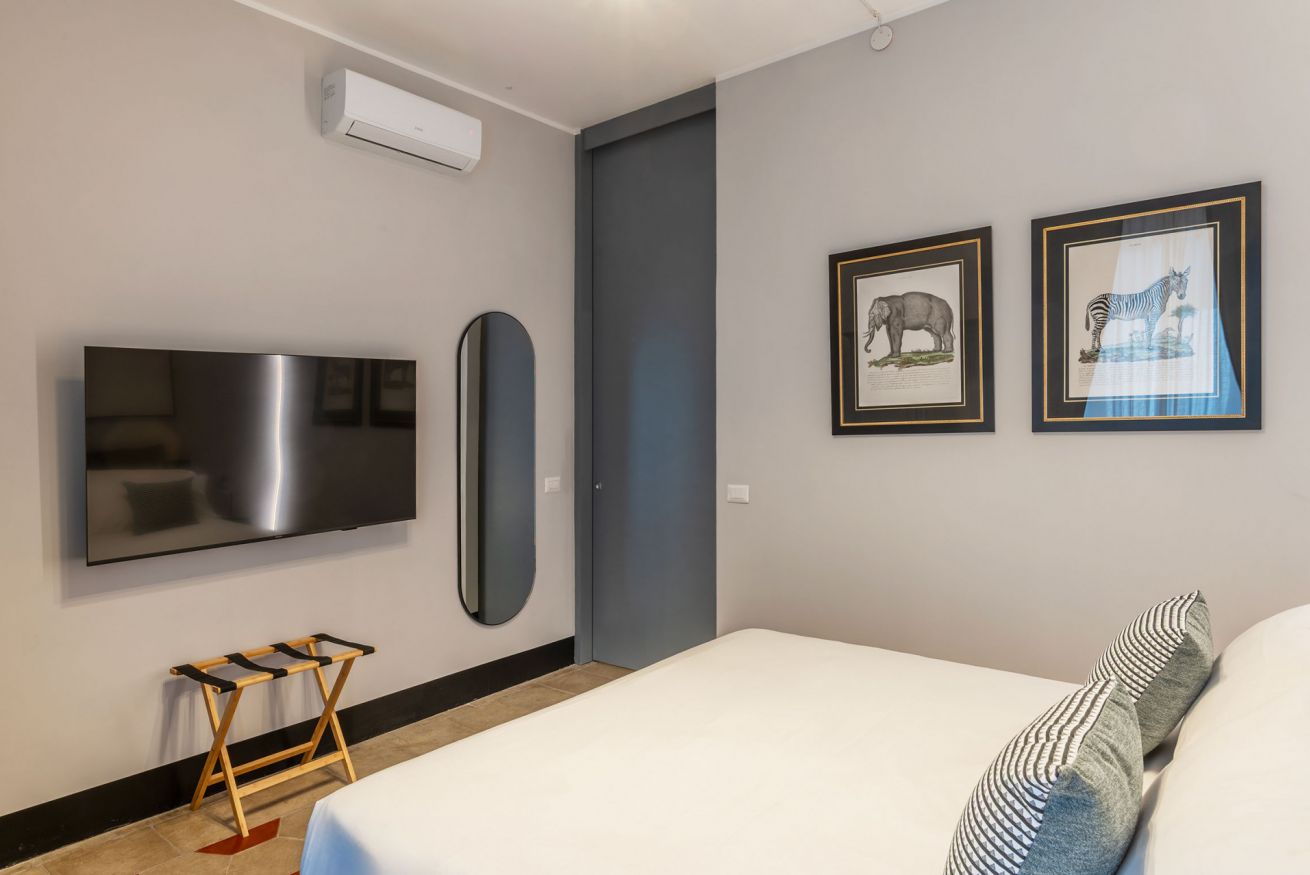 From the moment you enter, there is a clear balance between history and modern design. The original cementine floors, with their distinctive hexagonal geometries, bring warmth and personality to the space, while clean lines, soft grey tones and carefully selected artwork create a fresh and distinctive identity. The red SMEG refrigerator becomes an iconic, almost scenographic feature, interacting beautifully with the blue geometric wallpaper and the neutral palette of the furnishings, adding character without compromising the overall elegance.