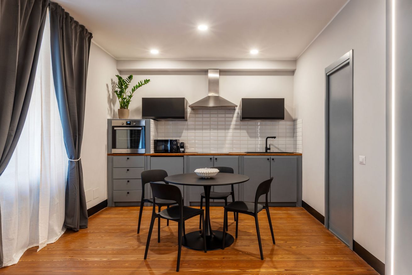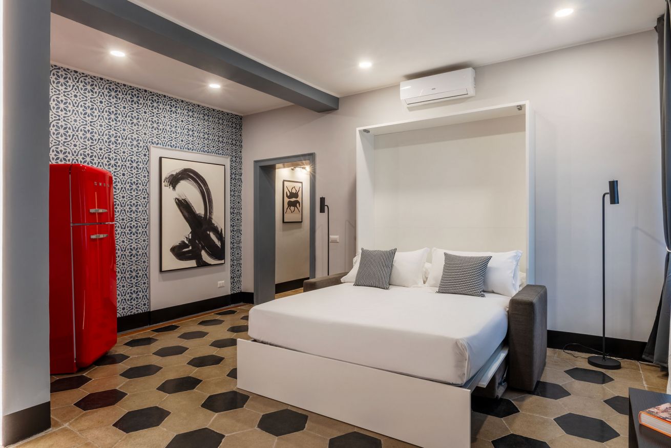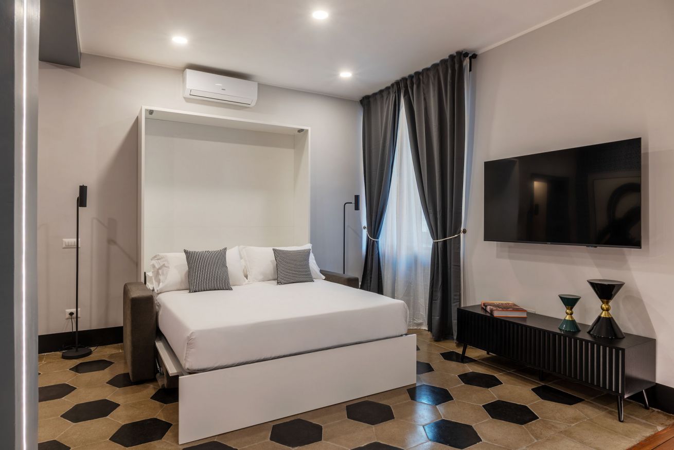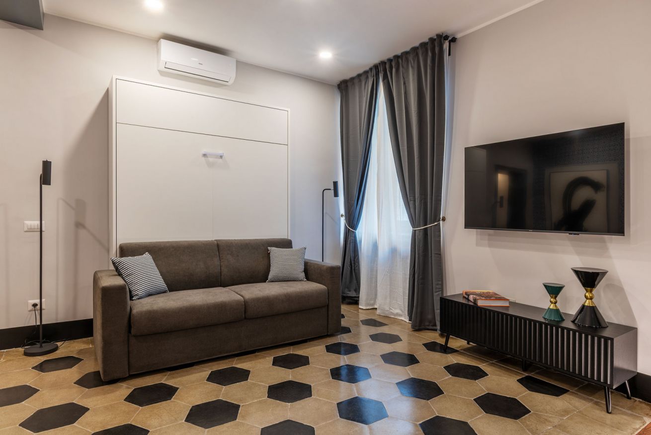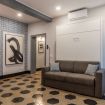 The living area has been designed to adapt seamlessly to different moments of the day. The double Murphy bed effortlessly transforms into a comfortable sofa, allowing the apartment to accommodate up to four guests while maintaining visual harmony and generous living space. When closed, the wall returns to a minimalist appearance and the room becomes an ideal setting to unwind after a day exploring Rome. The kitchen, slightly elevated on a wooden platform that elegantly defines the dining area, is fully equipped with an induction hob, oven, microwave, dishwasher, washer-dryer, Nespresso machine, kettle and toaster, ensuring maximum comfort for both short and extended stays.