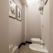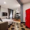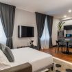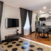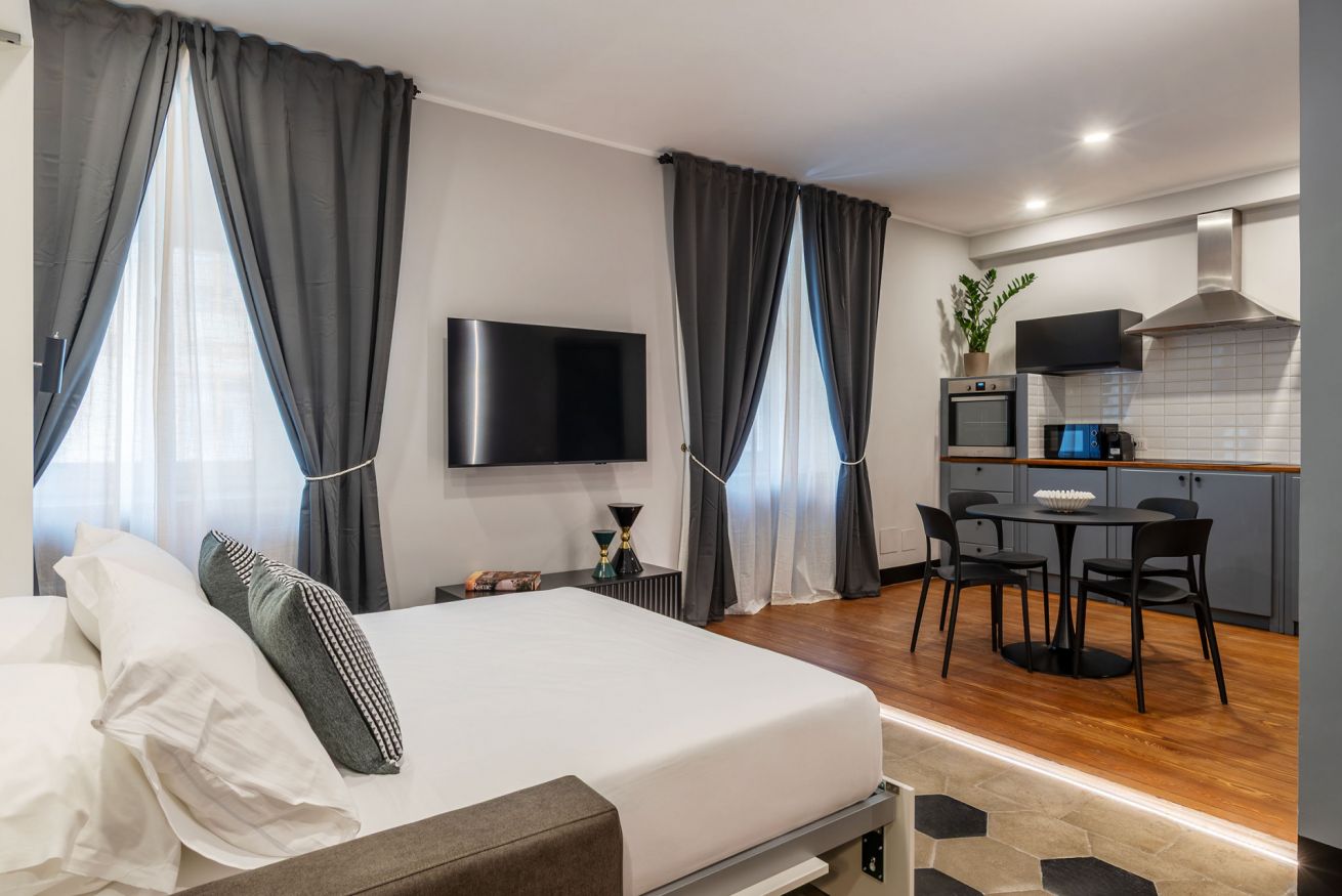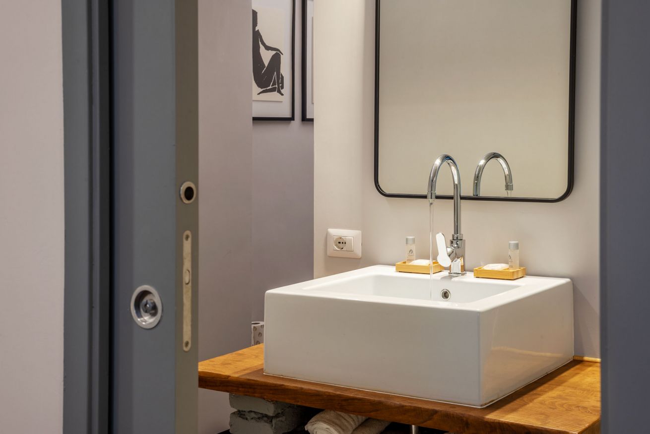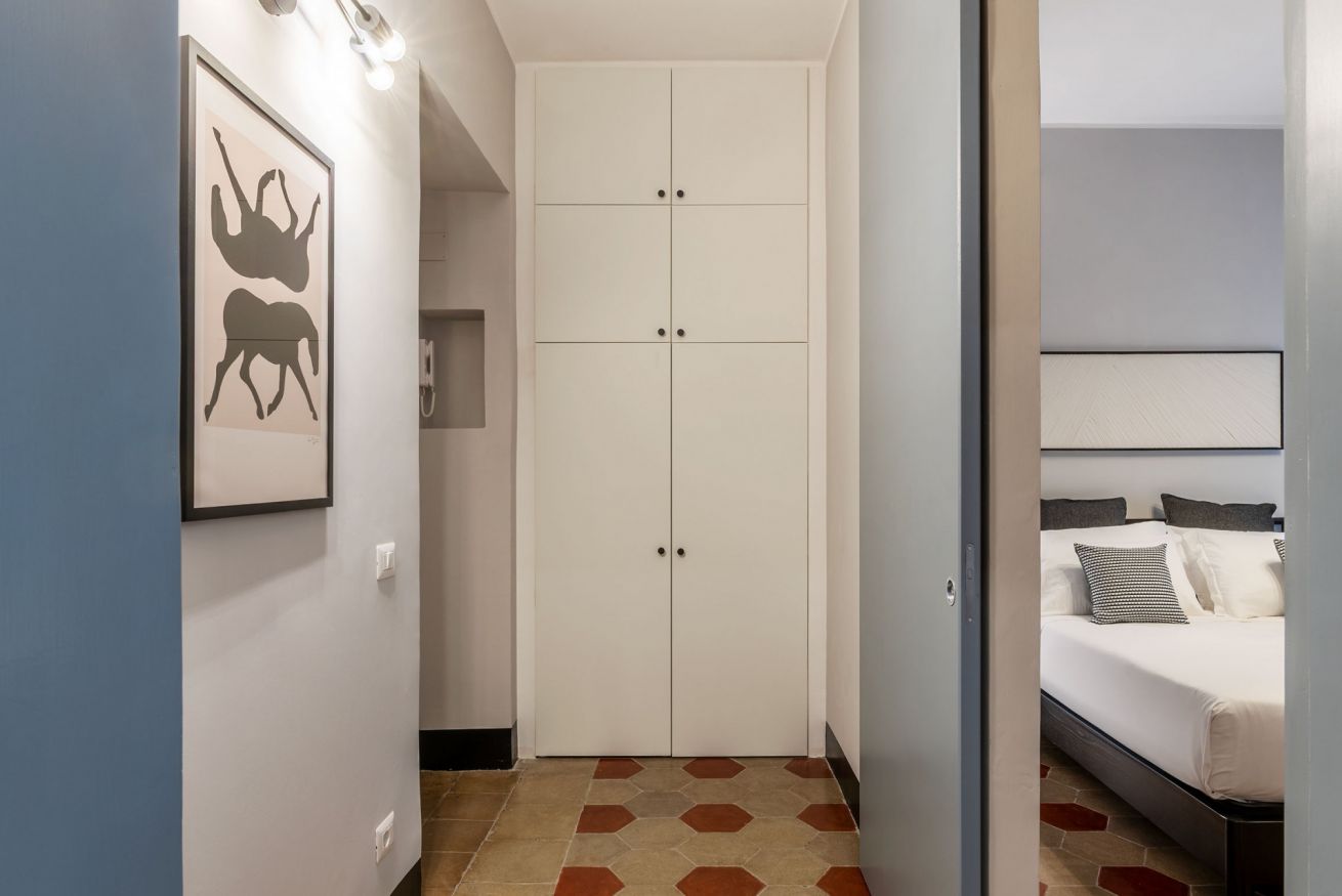 The living area has been designed to adapt seamlessly to different moments of the day. The double Murphy bed effortlessly transforms into a comfortable sofa, allowing the apartment to accommodate up to four guests while maintaining visual harmony and generous living space. When closed, the wall returns to a minimalist appearance and the room becomes an ideal setting to unwind after a day exploring Rome. The kitchen, slightly elevated on a wooden platform that elegantly defines the dining area, is fully equipped with an induction hob, oven, microwave, dishwasher, washer-dryer, Nespresso machine, kettle and toaster, ensuring maximum comfort for both short and extended stays.