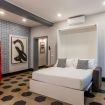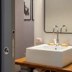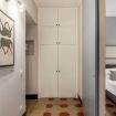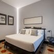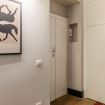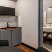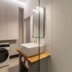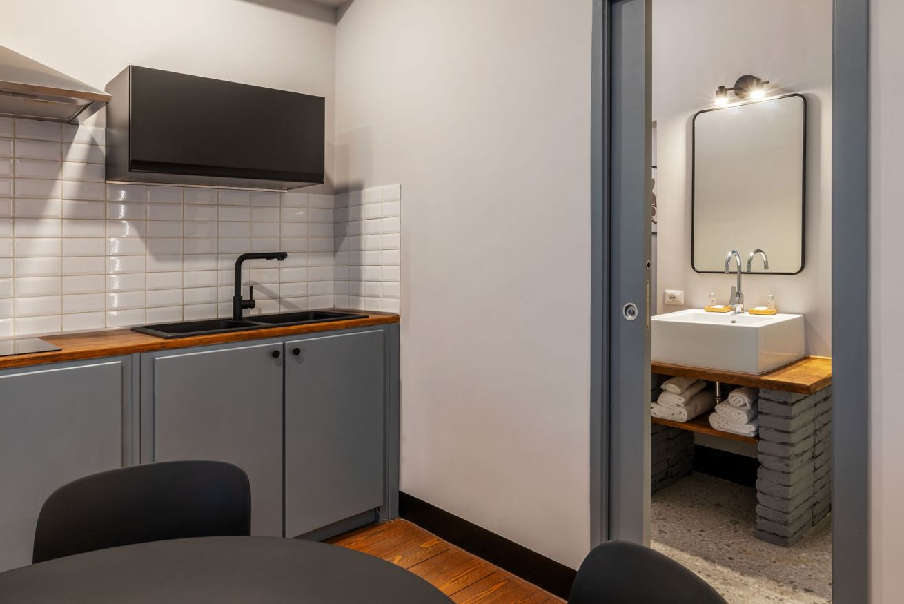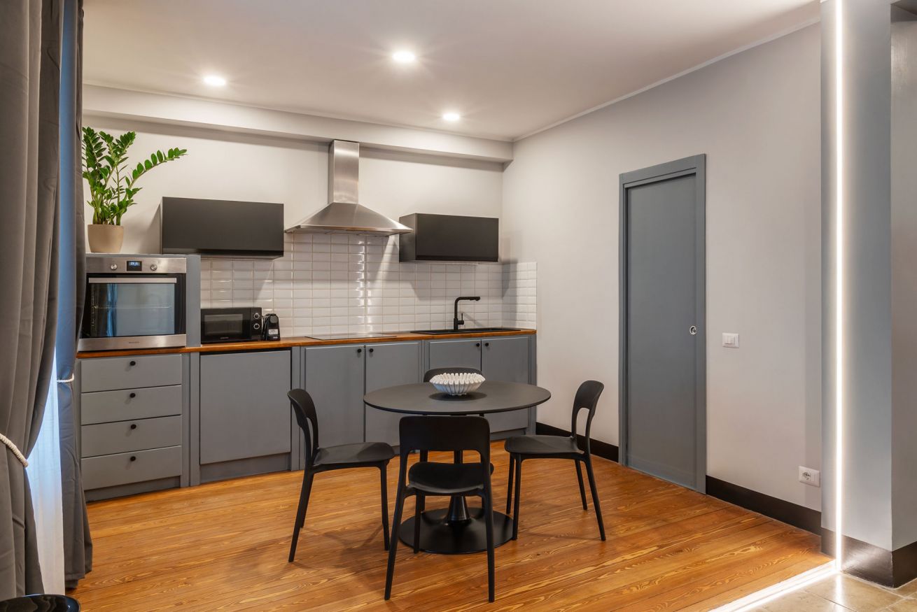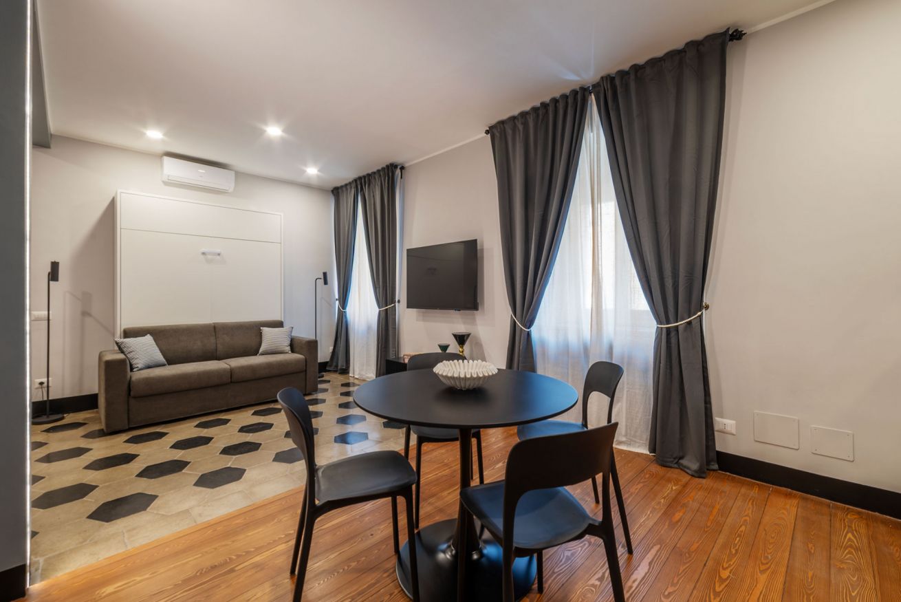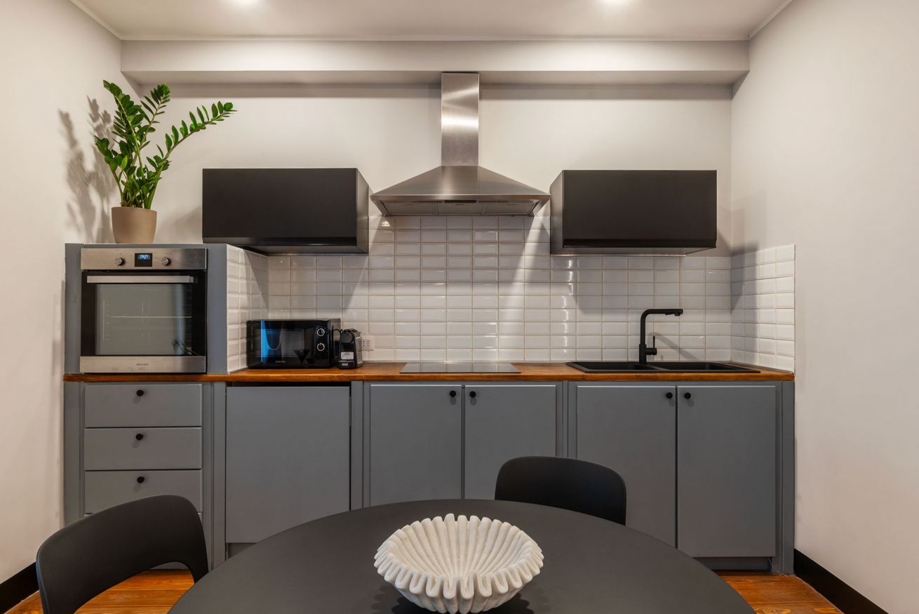 The living area has been designed to adapt seamlessly to different moments of the day. The double Murphy bed effortlessly transforms into a comfortable sofa, allowing the apartment to accommodate up to four guests while maintaining visual harmony and generous living space. When closed, the wall returns to a minimalist appearance and the room becomes an ideal setting to unwind after a day exploring Rome. The kitchen, slightly elevated on a wooden platform that elegantly defines the dining area, is fully equipped with an induction hob, oven, microwave, dishwasher, washer-dryer, Nespresso machine, kettle and toaster, ensuring maximum comfort for both short and extended stays.