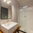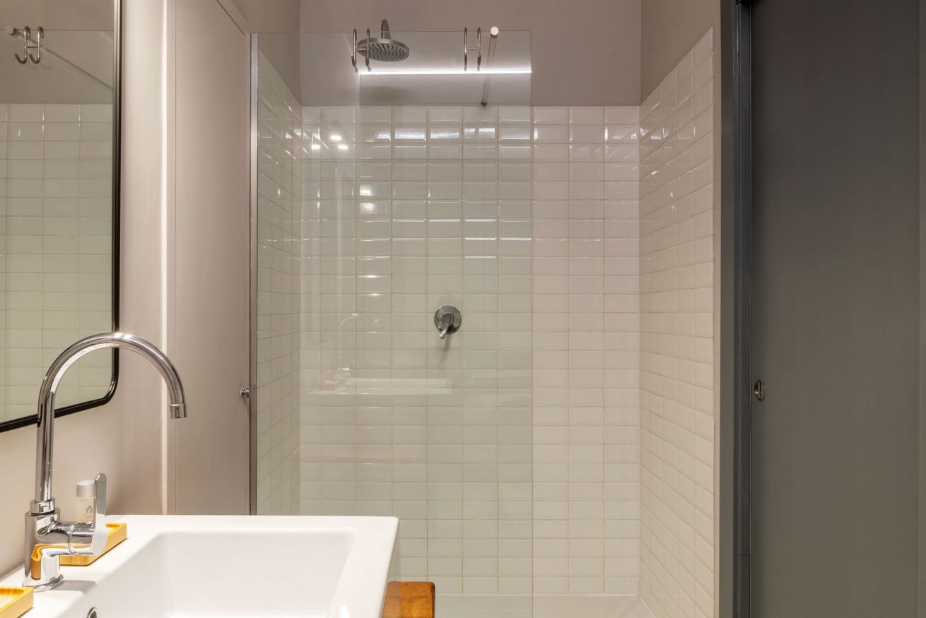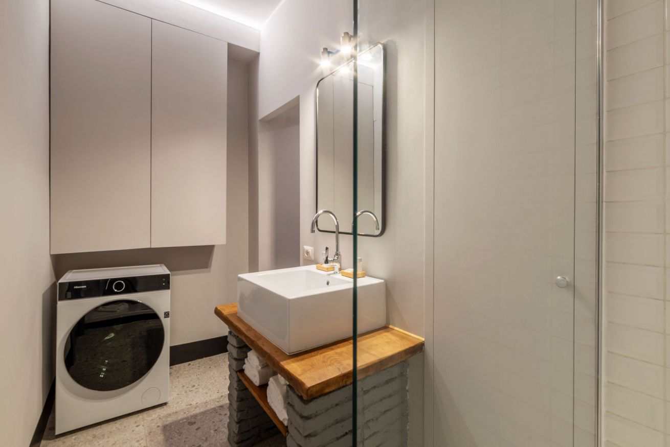 The bathroom is modern and essential in style, featuring a spacious walk-in shower and refined finishes that echo the apartment’s contemporary character. Independent air conditioning and air heating provide comfort throughout every season, while high-speed Wi-Fi and Smart TVs allow guests to connect to their preferred streaming services.