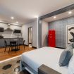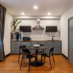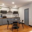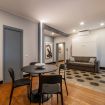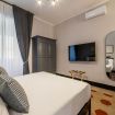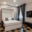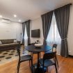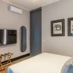 The apartment consists of a master bedroom and a bright living area with kitchen and dining space. The bedroom offers an intimate and relaxing retreat, featuring a comfortable double bed, thoughtfully designed lighting, a spacious wardrobe and a large Smart TV. The color palette is understated and refined, enriched by textured fabrics and contemporary details that enhance comfort without excess.