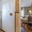 Downstairs by the entrance door, with plenty of closet space everywhere you look, is a fully equipped kitchen with a large living room (+ dining table) and two bedrooms, one of which features a walk-in closet and a small ensuite bathroom (only featuring a sink and toilet, with no shower. This is where the flat’s washing machine is located). A second bathroom has a bathtub which doubles as a shower.